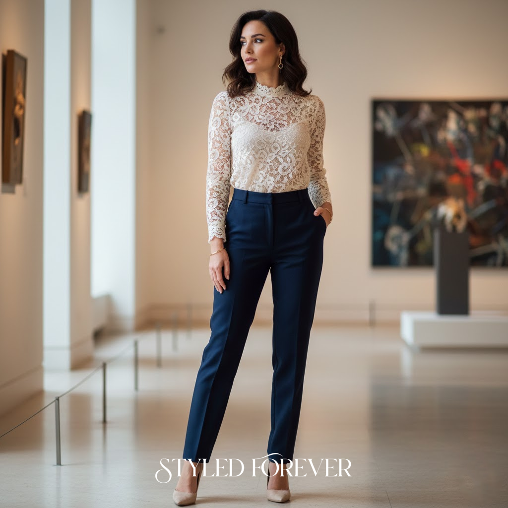 17. Lace Blouse with Tailored Trousers
