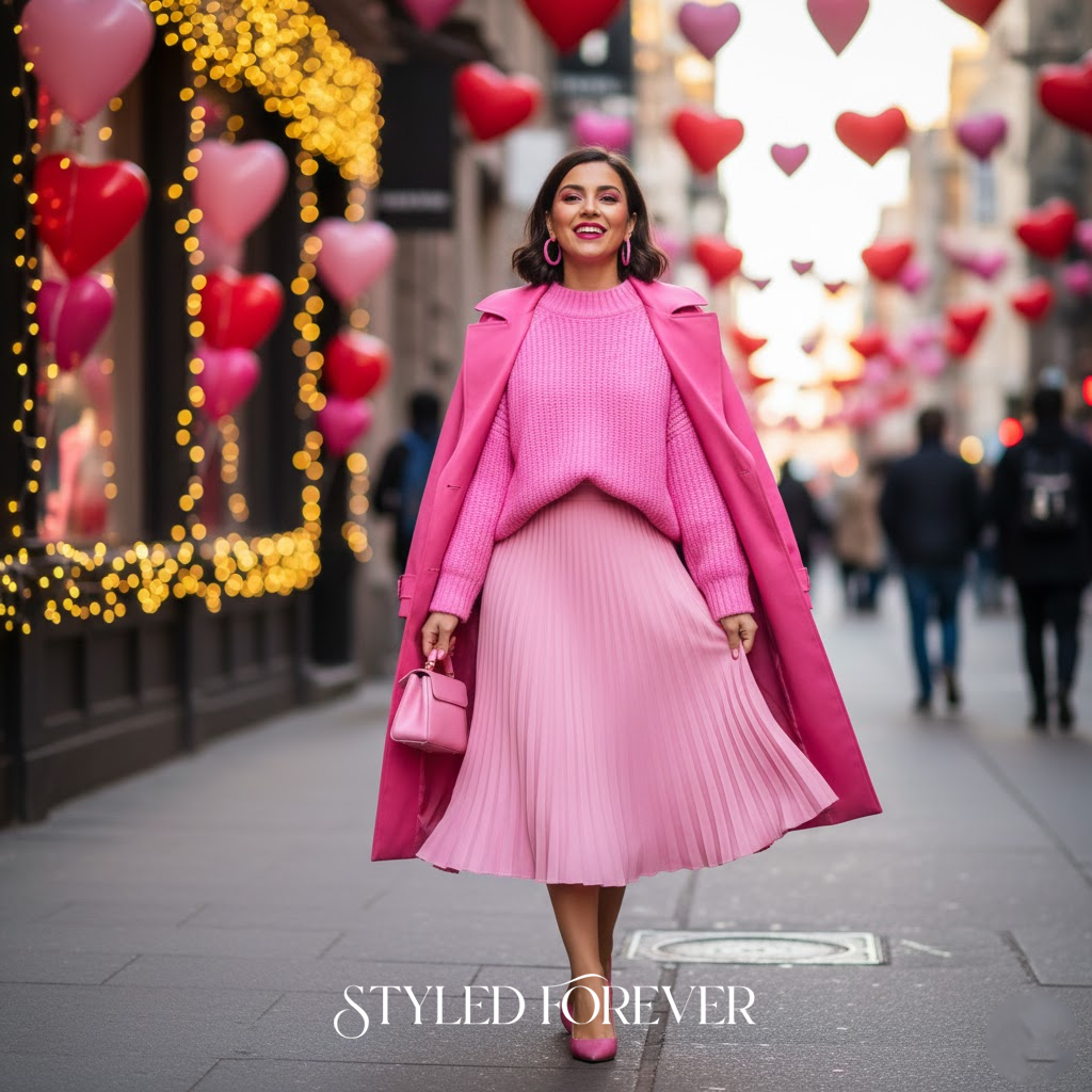 Wearing all-pink feels playful and delightful. It’s a fun way to step into the spirit of Valentine’s Day with confidence and brightness.