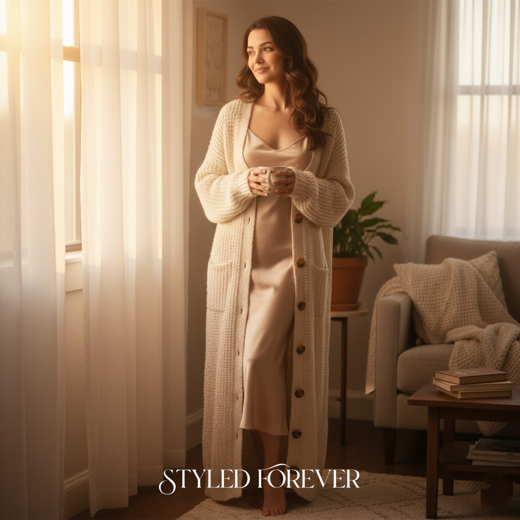 A long cardigan softens the silhouette of a slip dress, creating a dreamy layered look. It feels like you’re wrapped in a little cloud.