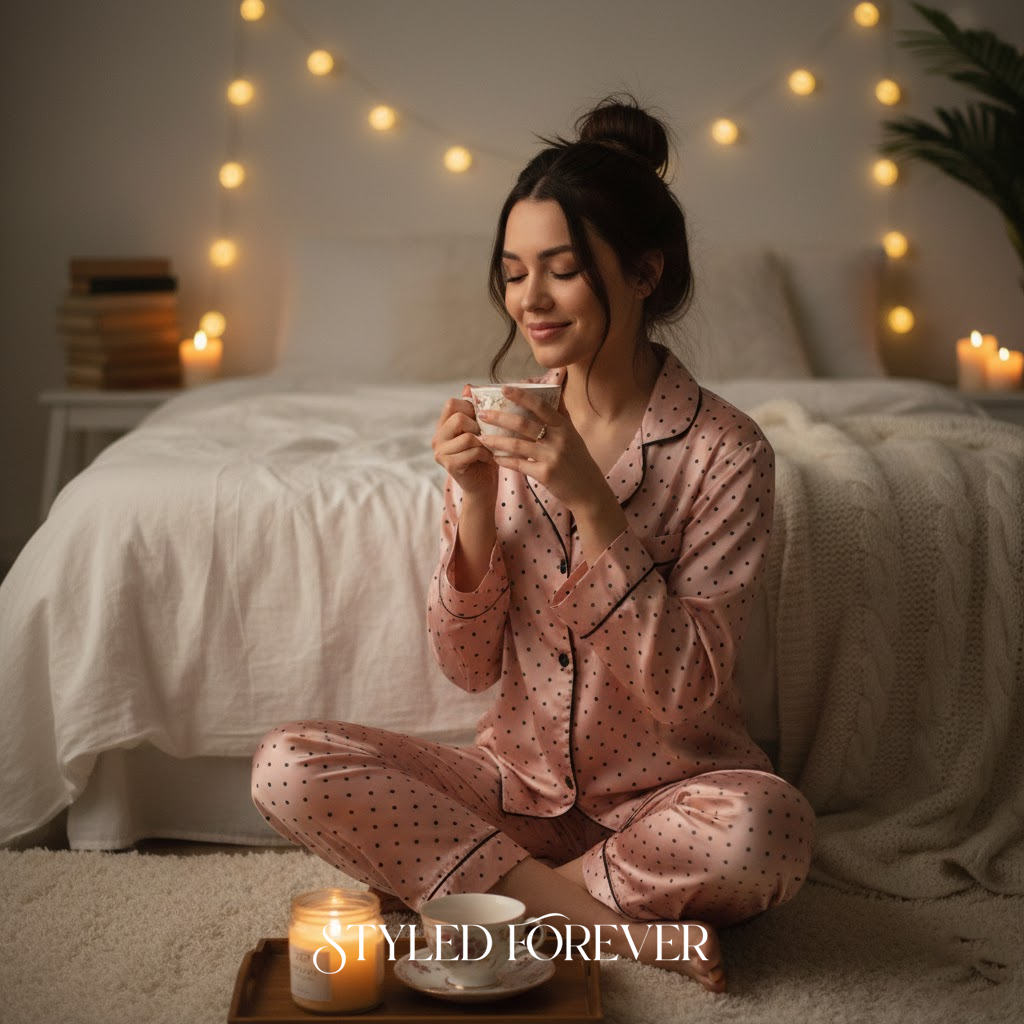 If your evening is all about treating yourself, a cute matching pajama set feels comforting. Light a candle, make tea, and enjoy your own company with ease.