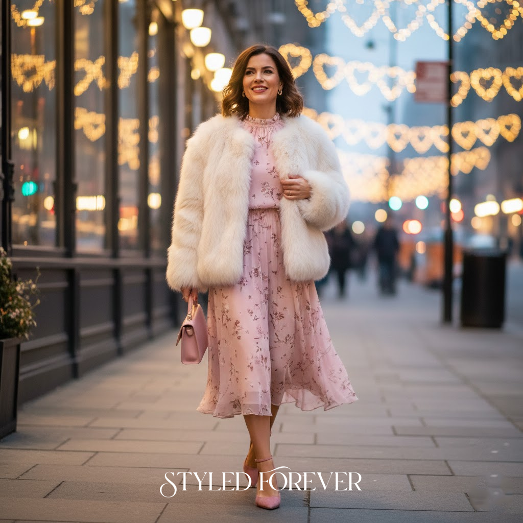A faux fur jacket adds cozy volume and warmth. Worn over a pink dress, the look feels soft yet confident—perfect for breezy February evenings.
