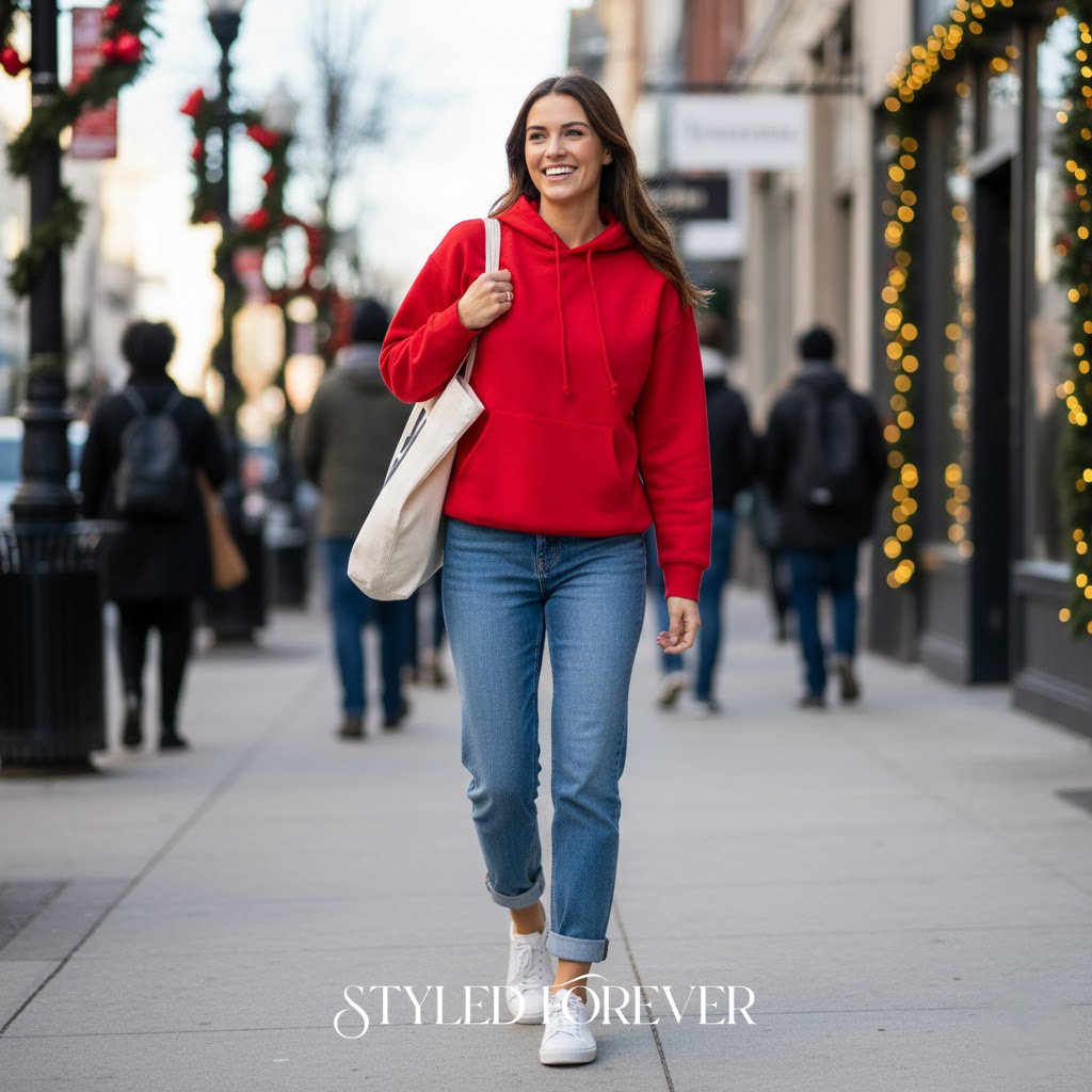 If your day is casual and full of errands, a red hoodie paired with denim brings comfort while still keeping the festive mood alive.