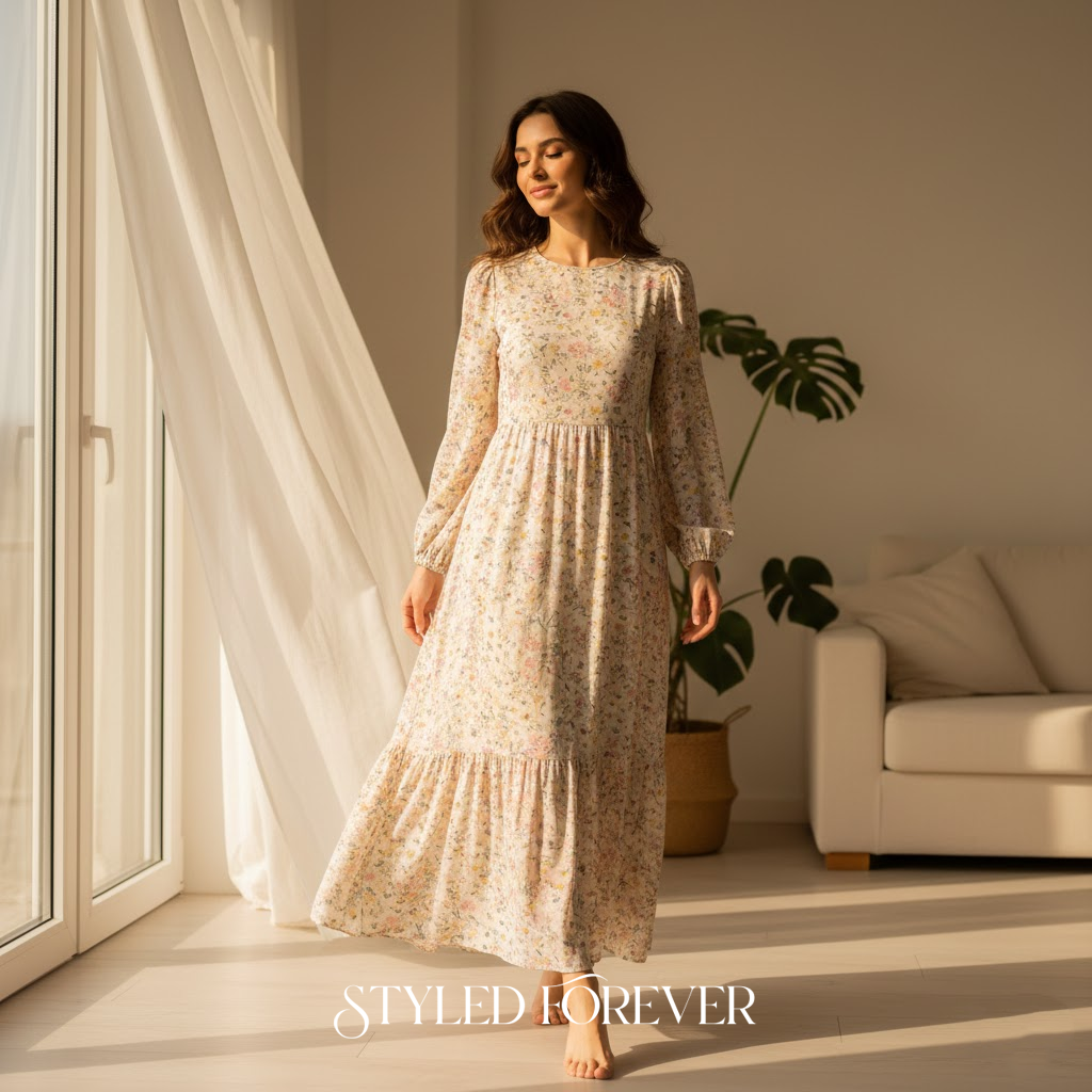 A maxi dress with long sleeves feels soft and flowy. It moves beautifully and adds a gentle romantic mood to your day.