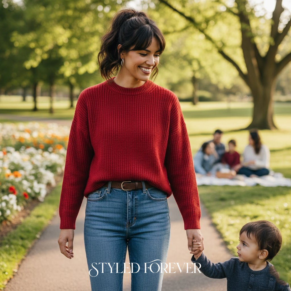 This look reminds me of the effortless outfits we wore for family outings—simple yet so pretty. A bright knit top tucked into jeans brings warmth and confidence. Great for casual plans where comfort is key.