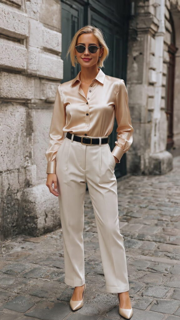 2. Champagne Satin Shirt + High-Waisted Cream Trousers + Black Belt