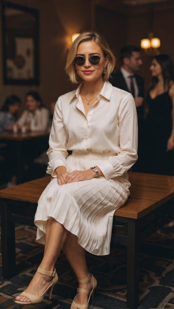 If you prefer a softer, more feminine approach, a light blouse tucked into a pleated midi skirt is quietly stunning. The pleats add movement and texture — the kind that catches the light in a room — while the tucked blouse keeps proportions neat. It’s an outfit that photographs beautifully and feels just as good in person.