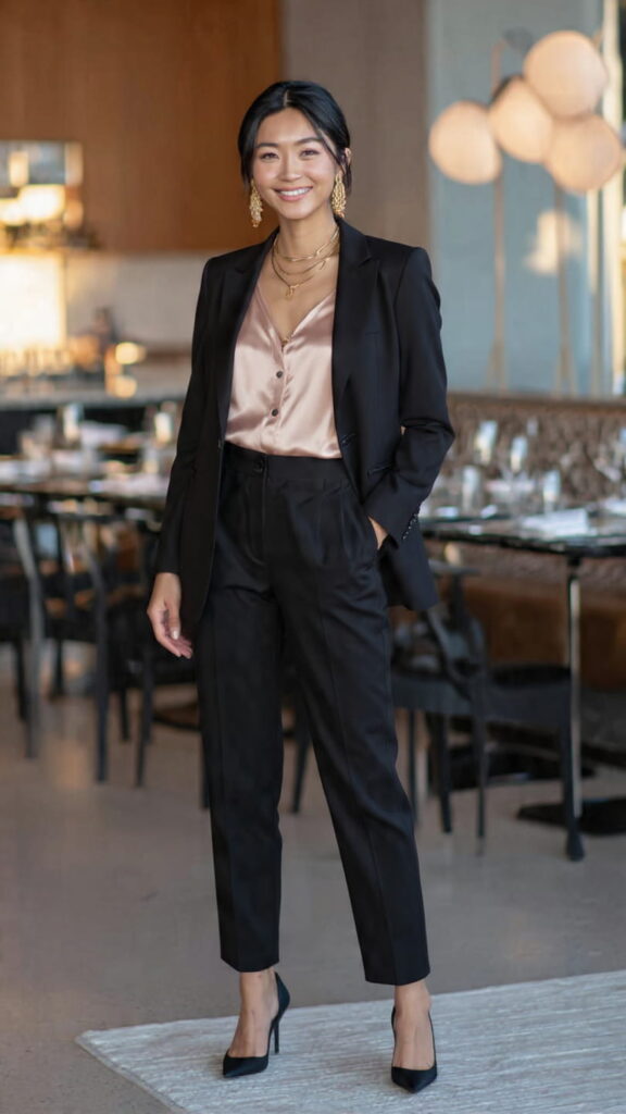 When the party leans dressier, a silky camisole under a classic blazer is one of the most flattering combinations in the business casual playbook. The satin against the structured blazer creates that structured-meets-fluid contrast that makes an outfit look deliberately styled. High-waisted trousers complete the polished silhouette.
