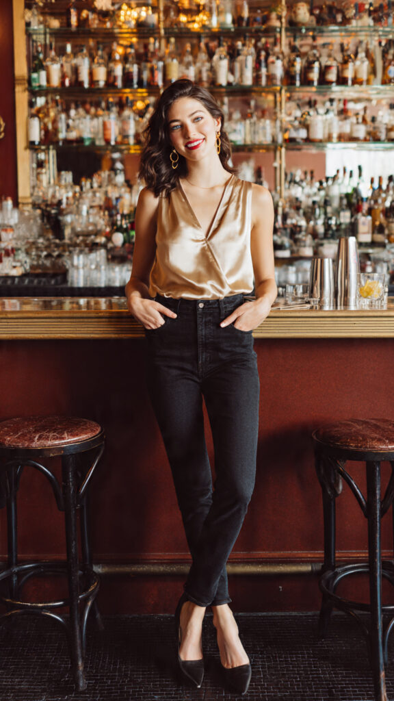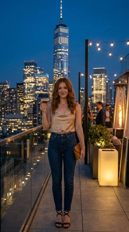“Jeans and a nice top” is a timeless casual bar formula — and when done right, it’s unbeatable. High-waisted dark-wash jeans instantly slim and elongate, while a silky camisole in champagne, ivory, or black adds that effortless going-out energy. Finish with strappy heels and gold hoop earrings. Simple, polished, done.