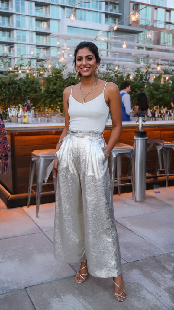 10. Metallic Wide-Leg Trousers + Simple White Top