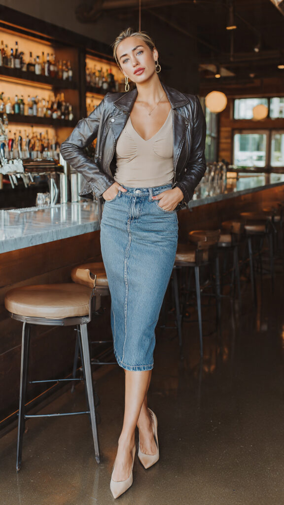 A neutral bodysuit — think taupe, black, or cream — tucked into a denim midi skirt creates a chic and effortless silhouette. The denim fabric keeps it firmly in casual territory, while the kitten heels and a leather jacket add an edgy, polished finish. This combo is perfect for when you want to look stylish without appearing overdressed.