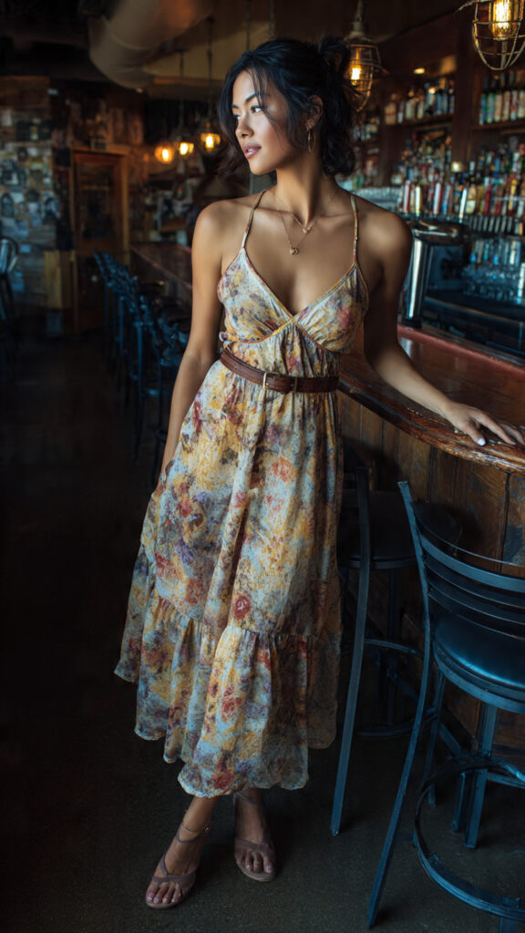 A floral or solid-coloured flowy midi dress is one of the easiest grab-and-go casual bar outfits you’ll ever own. The relaxed silhouette is comfortable, breathable, and feminine all at once. Pair with flat strappy sandals for a breezy, effortless look. Add a thin belt at the waist if you want to define your silhouette without compromising comfort.