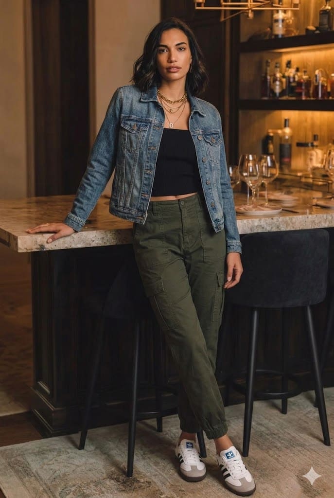 Pull your sleek black tube top out of the wardrobe and style it with trending cargo pants for a casual-cool look that feels intentional. A classic denim jacket layered over the top balances the exposed neckline and adds a relaxed, lived-in feel. Swap heels for Adidas Sambas or Gazelles to keep it street-style fresh.