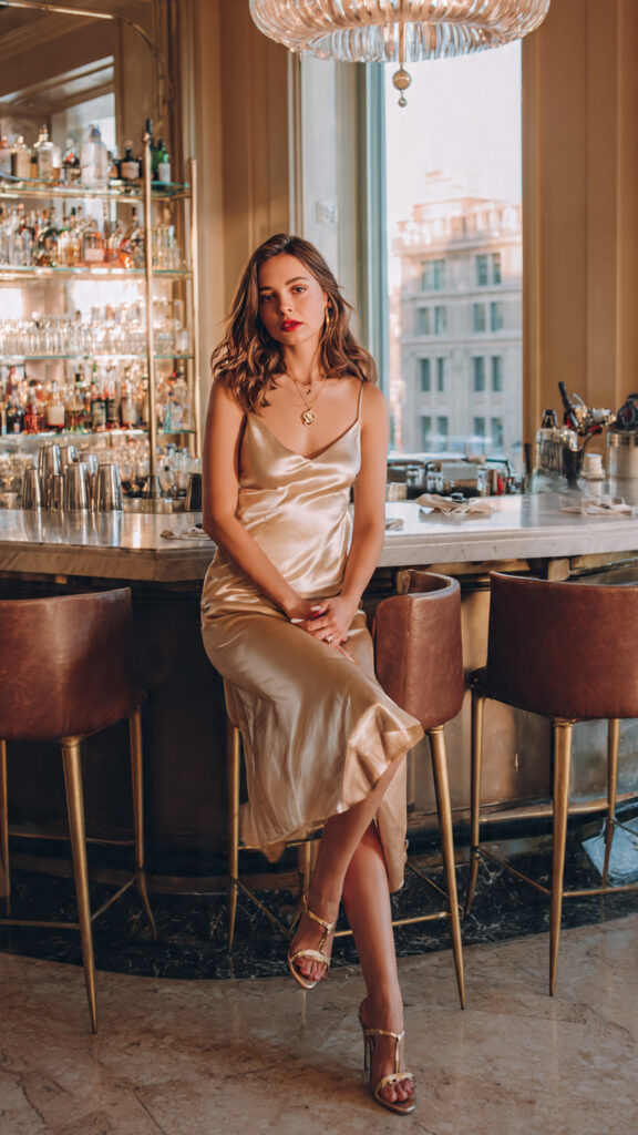 A champagne or ivory satin midi dress is the embodiment of quiet luxury. The fluid fabric glows warmly under city bar lighting, draping over the body in a way that looks effortless yet deliberate. Pair with strappy gold heels, a delicate pendant necklace, and soft waves for a look that is as elegant at 8pm as it is at midnight. This is the outfit that makes people across the bar ask who you are.