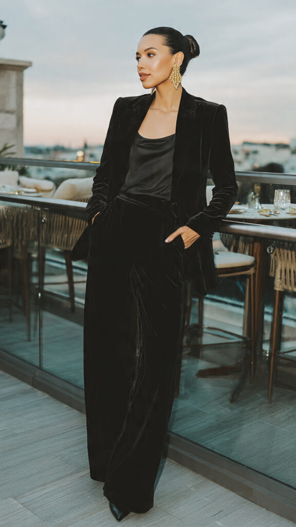 A matching black velvet blazer and wide-leg trouser set is power dressing at its most refined. Velvet absorbs and reflects city light in equal measure, giving the fabric a depth and richness that photographs beautifully. Style with a simple silk camisole underneath, pointed-toe heels, and sculptural gold earrings. Add a sleek bun to keep the focus on the sharp, structured silhouette.