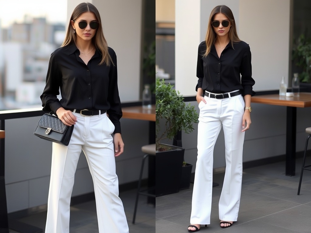 The reverse of the classic white-on-black, this combination is surprisingly fresh and undeniably chic. Crisp white wide-leg or straight-leg trousers paired with a black silk blouse — slightly tucked in the front — creates a contrast that’s clean, editorial, and impossible to ignore. Add black strappy heels, a gold chain belt, and sleek straight hair for a look that exudes effortless class.