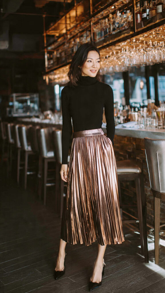 A rose gold or bronze metallic pleated midi skirt catches every photon of light in the room — it shimmers with every step and photographs like a fashion editorial. Pair it with a fitted black or ivory turtleneck for contrast and balance. The high neckline and floor-skimming metallic skirt create a proportion that’s chic, unexpected, and completely memorable.