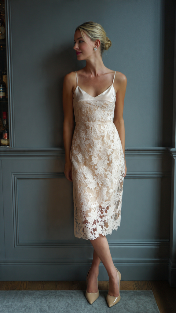 A delicate ivory lace midi dress worn over a satin slip is romantic, feminine, and quietly dazzling. The lace overlay creates texture and depth while the satin underneath catches the light for a dual-fabric effect that looks expensive and carefully considered. Style with champagne heeled mules, pearl earrings, and a loose, effortless updo.